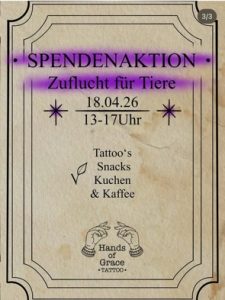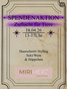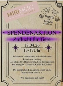 Miri Merz hair & spa und und Hands of Grace Tattoo veranstalten am 18.04.2026 in Oy-Mittelberg eine Spendenaktion für die Zuflucht.